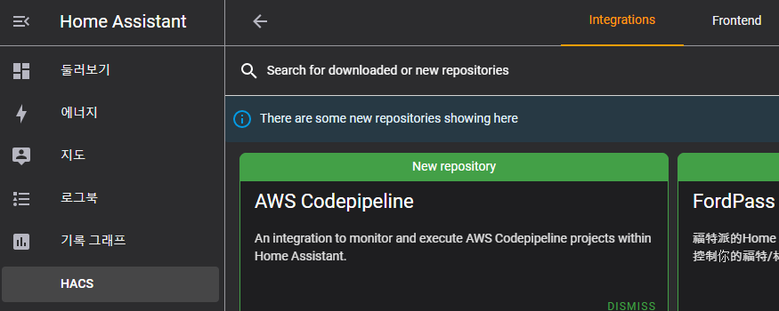 왼쪽 메뉴에서 'HACS'를 누르시고,