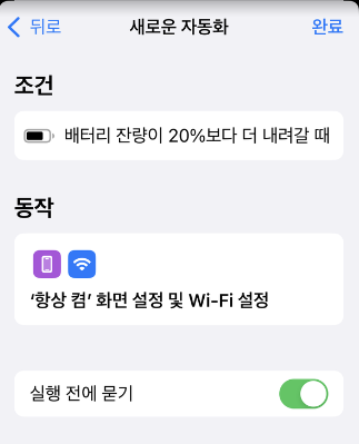 작동 조건은 배터리가 20% 미만일 때로 하였으니,